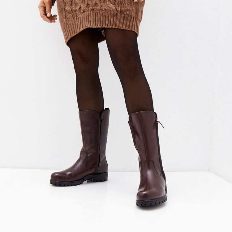 Лаконичный силуэт с высоким округлым голенищем приобретает актуальный вид благодаря боковым молниям и подошве с характерным протектором.