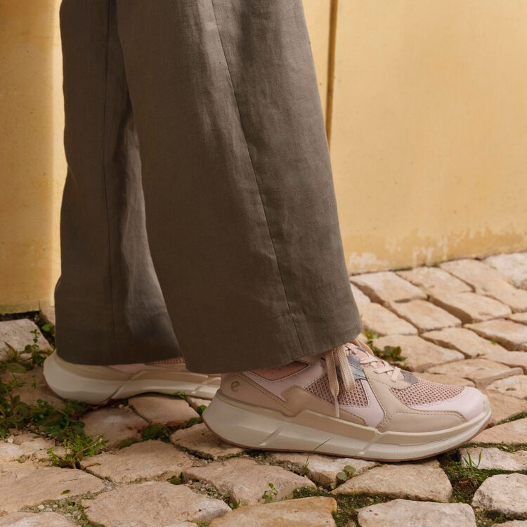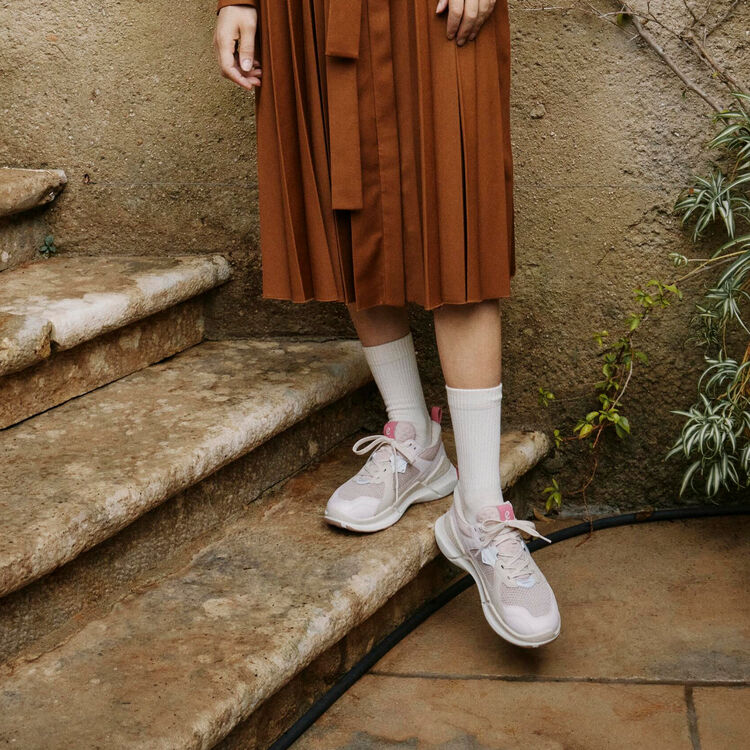 Пастельные оттенки отлично гармонируют с яркими акцентами на язычке и пятке, а вставки из сетчатого дышащего текстиля не только способствуют комфортному микроклимату в обуви, но и смотрятся современно и актуально.